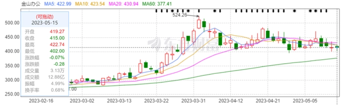 众所周知,从ChatGPT诞生以来,相关概念股股价都得到了不同程度的提升,金山办公的股价同样暴涨,由2022年11月底的255.78/股,涨至4月初的524.26元/股,涨幅一度超过105%。截至5月15日收盘,金山办公股价为415.00元,总市值为1914亿元。从去年11月底至今市值增长超730亿元。
