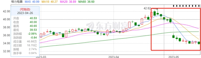 在孟羽童进入格力前,2021年6月格力股价最高位50.21元/股,2023年5月9日,孟羽童微博“官宣”离职格力,这一日,格力的收盘股价为34.67元/股。一年零十个月,孟羽童在格力期间,她的“网红”身份并未对格力股价带来上升,反而下降了15.54元,跌幅为31%。