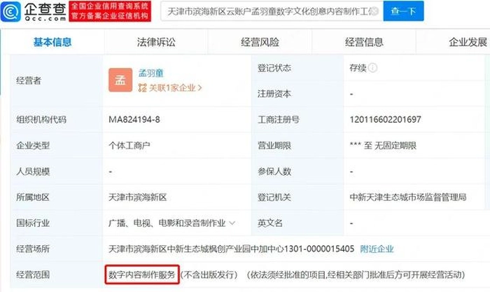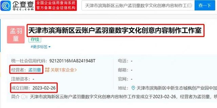 但BT财经发现,在辟谣后不久,孟羽童就在天津注册了自己的公司,企查查数据显示,天津市滨海新区云账户孟羽童数字文化创意内容制作工作室的注册日期为2023年2月26日。且工作室涉及的内容为数字内容制作服务,也就是包含着直播带货。
