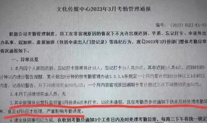 网上有和孟羽童一个部门的格力员工晒出了“3月份考勤管理通报”,里面明确的写道“孟羽童3月份共6次未打卡,12次未请假,”。从考勤文件中可以看出,一个月23个工作日中,孟羽童有6次未打卡,12次未请假,即便期间有重合也至少有12次违反公司记录,任何一个公司可能都无法容忍一个员工有超过一半以上的工作时间违纪,于是孟羽童“离职”又在情理之中。