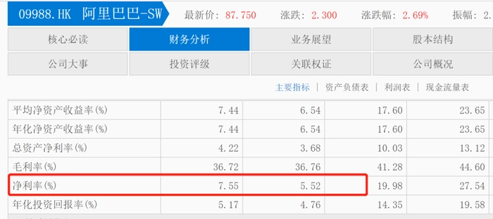 营收增幅仅为2%,但净利润增幅高达39%,这说明阿里巴巴的净利率有了较大提升。财报显示,2023财年,阿里巴巴的毛利率36.72%,相比2022财年的36.76%下滑了0.04个百分点,而对比2021财年的41.28%和2020财年的44.60%毛利率下滑幅度更大。净利率方面,阿里巴巴2023财年的净利率为7.55%,相比上一财年的5.52%提升了2.03个百分点。