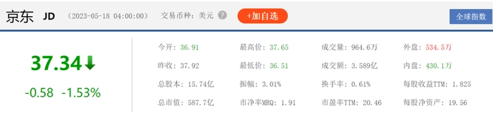 同期,京东的毛利率为14.06%,净利率为0.93%。同一日京东股价下跌1.53%,总市值为587.7亿美元。同为国内知名电商品牌,阿里巴巴的毛利率和净利率都高于京东,且在总市值上,阿里巴巴2344亿美元的总市值是京东总市值的4倍。