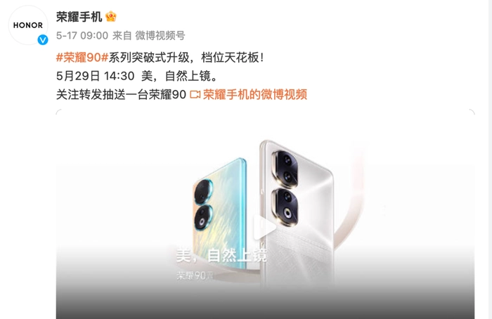 5月17日,荣耀CEO赵明发文宣布荣耀90系列将于5月29日全球发布,作为2023年荣耀公司新一代的次旗舰手机产品线。5月18日,荣耀手机官微宣布荣耀90系列全球代言人为男星杨洋,此前荣耀60、70、80系列的代言人则是龚俊。
