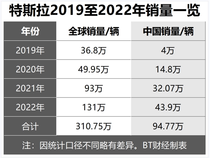 BT财经梳理一下特斯拉自2019年以来的销量,数据显示,2019年,特斯拉全球销量36.8万辆,其中中国市场销量4万辆,2020年全球销量49.95万辆,中国市场销量14.8万辆,2021年和2022年两项数据分别为93万辆、32.07万辆和131万辆、43.9万辆。近4年特斯拉总销量为310.75万辆,中国市场销量94.77万辆。