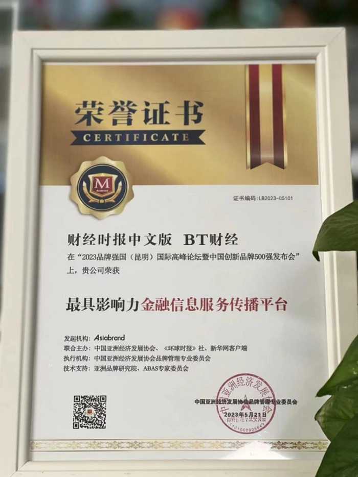 2023年5月21日,在昆明举行的2023品牌强国(昆明)国际高峰论坛上,BT财经作为唯一一家数据平台参加了会议,并在随后的颁奖典礼上被品牌强国论坛组委会和中国亚洲经济发展协会品牌管理专业委员会共同评选为“最具影响力的金融信息服务传播平台”。
