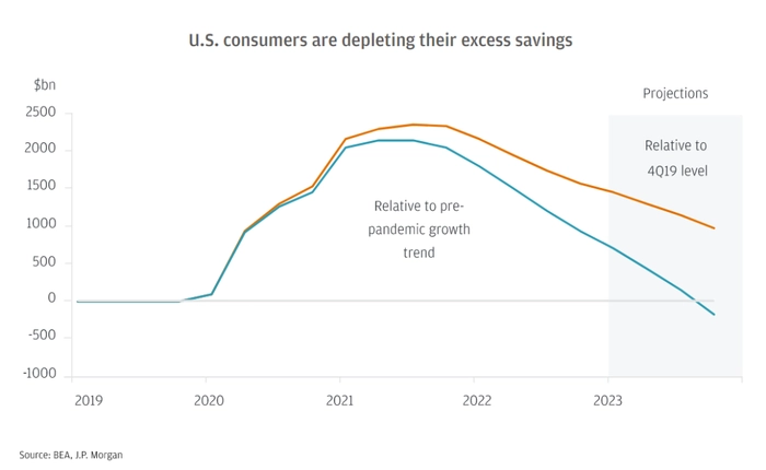 这在一定程度上是因为消费者正在逐渐耗尽他们在疫情期间积累的超额储蓄。摩根大通研究机构的数据显示,美国的超额储蓄在2021年第二季度达到约2.1万亿美元的峰值,在2022年第四季度降至约8000亿美元。预计这一数字将随着时间的推移继续减少。预计到2023年第三季度,这一超额储蓄的缓冲将完全耗尽。