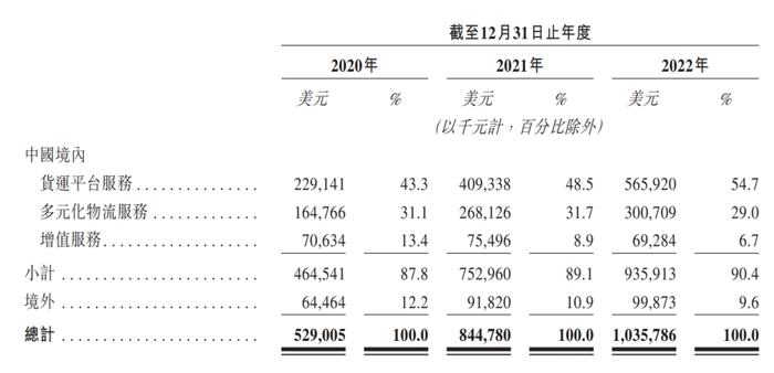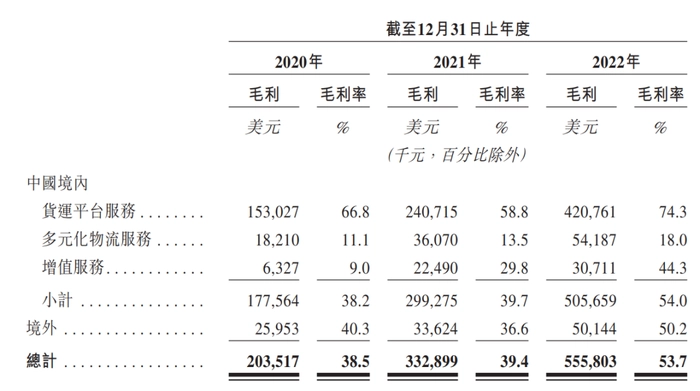 从营收来看,货运平台服务是整体营收的支柱,2020年占比达到43.3%,2022年则增长至54.7%。多元化物流服务营收占比微弱下调,基本上保持在30%左右。增值服务营收占比则出现了较大程度的下滑,由2020年的13.4%降为6.7%,还比不上境外收入。