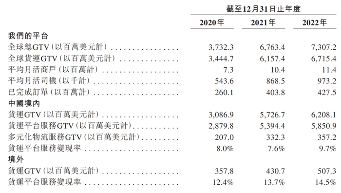 招股书显示,货拉拉的全球GTV由2020年的37.32亿美元增至2022年的73.07亿美元,复合年增长率为39.9%。根据弗若斯特沙利文的资料,截至2022年上半年,货拉拉是全球闭环货运交易总值(GTV)最大的物流交易平台,也是全球闭环货运GTV最大的同城物流交易平台,还是全球平均月活商户最大的物流交易平台以及全球已完成订单数量最大的物流交易平台。