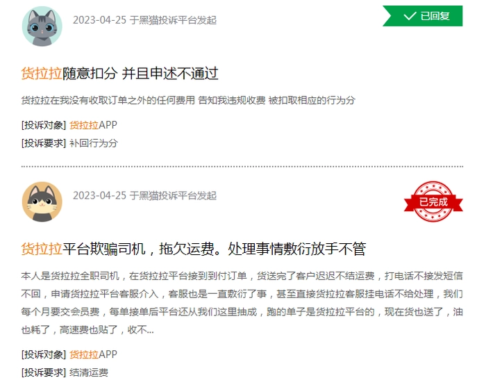截止5月25日,黑猫投诉网站上显示,货拉拉累计投诉量高达25028件,满意度仅为3颗星。其中不乏司机投诉,主要包括货拉拉存在乱扣行为分、拖欠运费、无法退还司机押金、抽成太高等问题。