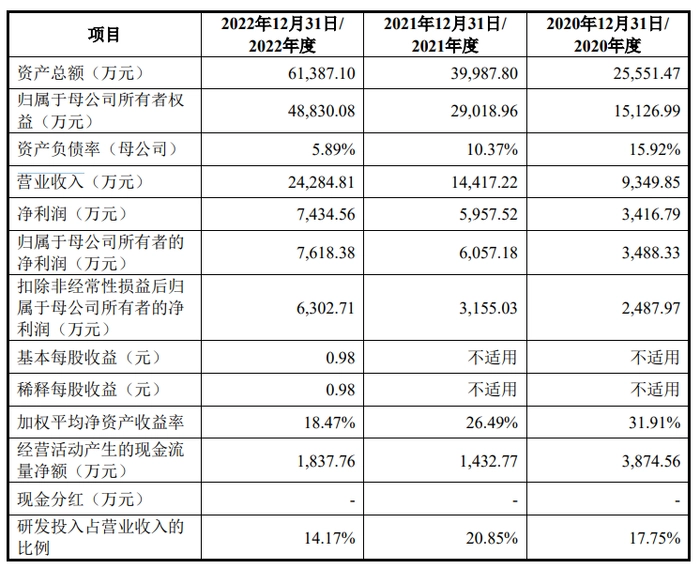 先看营收,公司2020年、2021年、2022年分别实现营业收入9349.85万元、1.44亿元及2.43亿元,同比增速在2021年和2022年录得55%和69%,增速呈现加快的趋势。