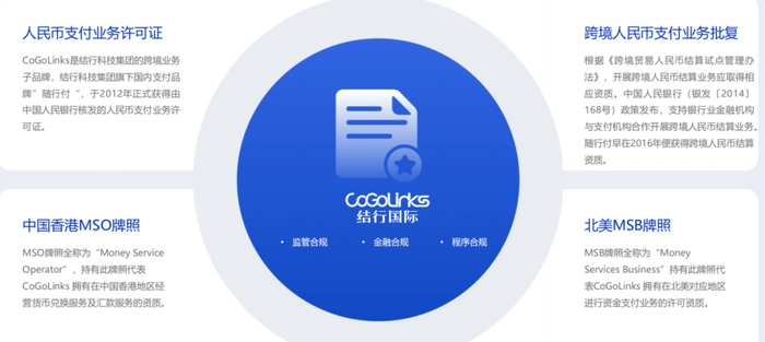 CoGoLinks(结行国际)是结行科技集团的跨境业务子品牌,结行科技集团旗下包含国内支付品牌“随行付”在内,涵盖智慧支付、智慧经营、跨境支付和产业金融四大板块。