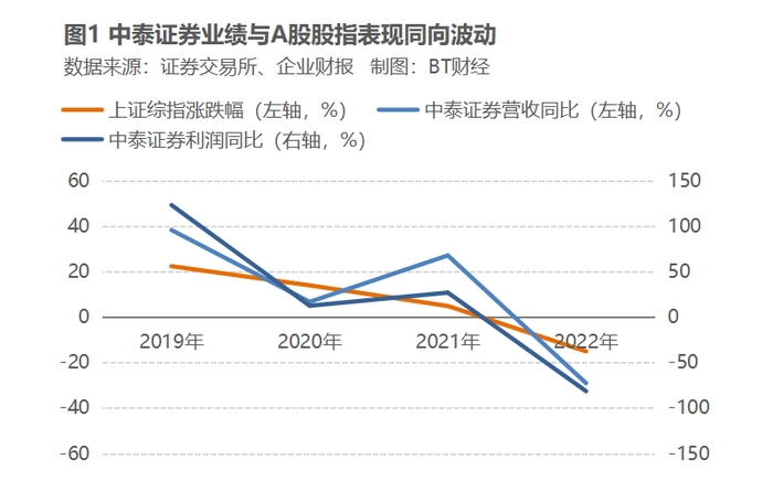 就连2023年一季度券商业绩回暖,也主要是因为当季A股表现回升。4月初,中泰证券在行业内一马当先率先披露季报,营收净利同比双增,营收录得35.7亿元、同比增长92.77%,归属净利润录得11.53亿元,同比增长424%。那时候上证指数走出“小阳春”行情,当季上涨5.94%。