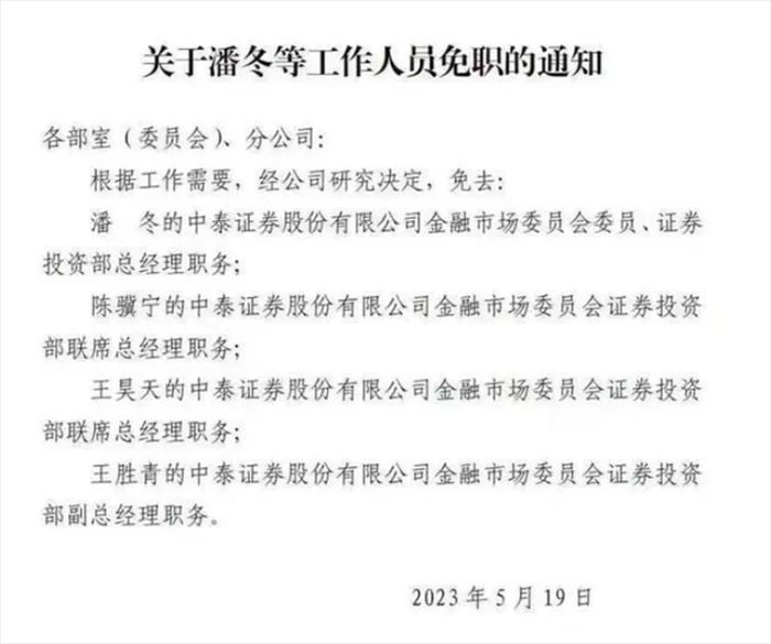 首先是业务和人事变动问题。据网上流传的消息,中泰证券大刀阔斧地全员解散了自营部门,并且免去了4位级别较高的负责人的职务,包括金融市场委员会委员、证券投资部总经理潘冬等。