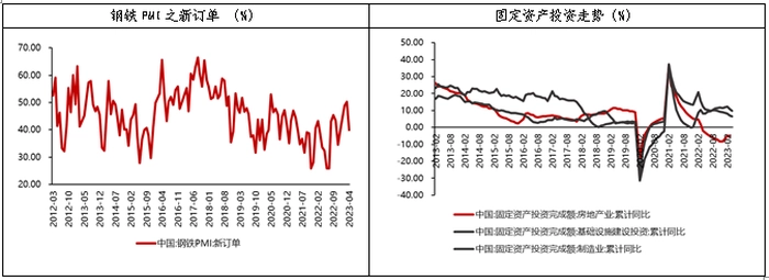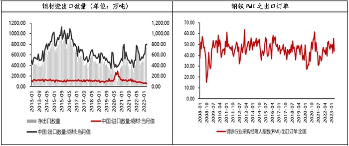 外需层面,钢材出口短期保持一定韧性。2023年1-4月,钢材进口249.5万吨,累计同比下降40.2%,出口2801.2万吨,累计同比上升54.3%,净出口2551.7万吨,累计同比上升82.5%。年初以来钢材净出口“四连升”。