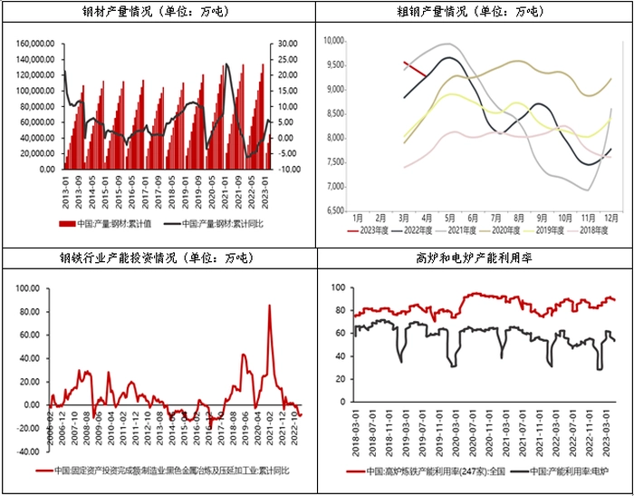 政策层面,2023年粗钢产量平控政策大概率定调为平控。近期,唐山丰南区发布2023年粗钢平控压减文件、河北工信局开展全省钢铁企业能效情况问卷调研等。一季度,粗钢产量2.6亿吨,同比增长6.1%,如粗钢产量调控政策定调为平控,在总量控制持平去年的前提下,一季度已超额生产831万吨,下半年存在动态调整和压降的空间;同时考虑到环保督查整改任务陆续进行以及潜在限产可能带来一定的扰动,粗钢产量增速或将有所放缓。