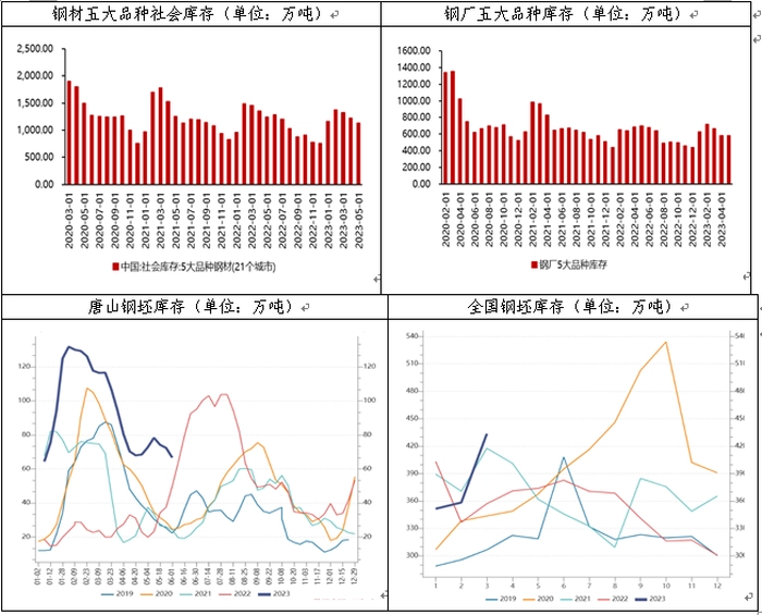 五大品种钢材库存有所去化,钢坯库存处于历史高位。春节后国内主要五大钢材品种库存呈现持续下降态势,截至5月底,钢材社会库存较上月环比下降5%、钢厂库存下降13%,且库存水平低于去年同期。然而,钢坯库存远高于往年同期水平。数据的差异在一定程度上揭示累库形式可能更多以半成品方式存在,而在成品端显示库存去化。