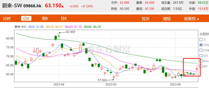 此消息一经曝出,蔚来港股股价当日在三连跌后上涨4.73%,收盘于63.150港元,总市值为1086亿港元,和高峰值相比,港股股价跌幅达68.3%,市值蒸发2338亿港元。