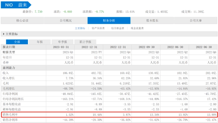 2022年,蔚来销售12.25万辆,亏损为145.6亿元,这意味着蔚来每销售1辆汽车就亏损约13万元。蔚来2022年年报显示,蔚来的现金减少100亿元。一季度的毛利率创下新低,虽说是卖得少可能亏损的更少,但对新能源车企来说,一旦销量上不去,就面临生死存亡的现实问题。