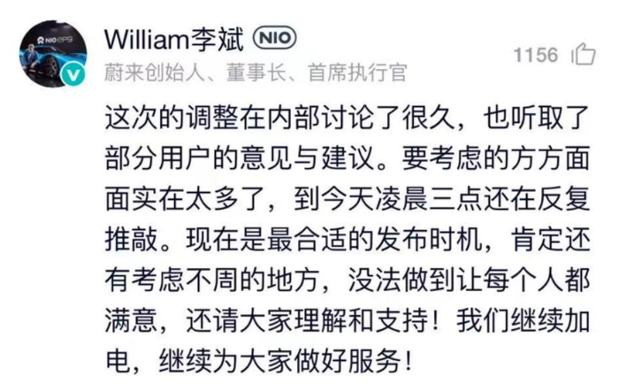 6月12日,蔚来汽车一则公告震惊了所有车主。蔚来宣布调整全系新车的价格及首任车主用车权益。具体表现为全系车型降价3万元,首任车主权益也出现不同程度的调整,免费换电补能不再作为标准用车权益,新用户可灵活选择在家充电或到充换电站付费补能。