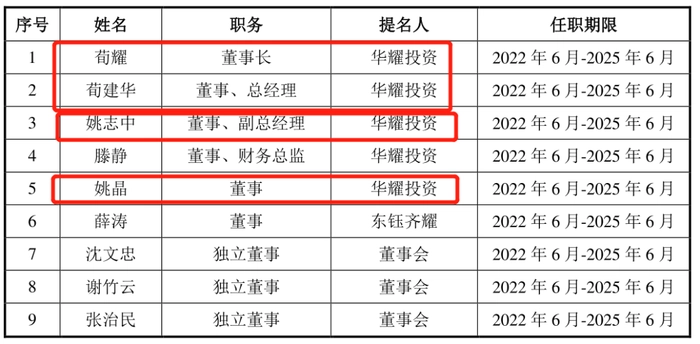在核心董事会中,荀建华及其亲属占据6名非独立董事中的4席,是不折不扣的“一言堂”。从创立时间来看,2019年8月,仅仅是在荀建华清仓套现的第二年,华耀光电的注册资本也仅有2.37亿元,不足荀建华套现的零头。