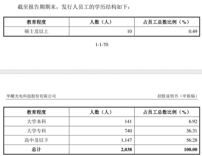 从招股书我们可以清楚地看到,华耀光电员工总数为2038人,其中研发人员仅为102人,占比仅有5%,甚至不如管理人员的113人多。而生产人员多达1797人,占比88.17%。从员工学历上看,本科人数仅占总人数的6.92%,专科、高中及高中以下学历的员工占总数的93.18%,作为一家科技企业,这样的人才结构让市场大跌眼镜。