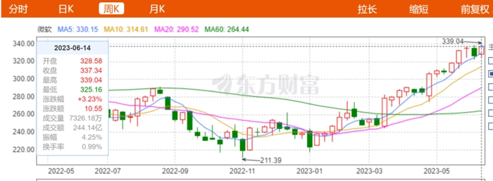 在2月初正式推出AI版必应后,微软的股价一度遭受重挫,其中2月24日一度暴跌3.43%,市值蒸发近千亿美元。但从3月10日开始微软股价又逐渐平稳上升,截至6月15日收盘,股价来到337.34美元,涨幅3.23%。