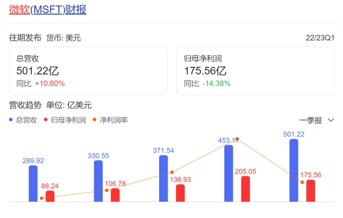 根据微软最新一季报数据,微软一季度总营收501.22亿美元,同比增长10.60%,但归母净利润却大幅下滑14.38%,降至175.56亿美元,相比去年同期的205.05亿美元下降了近30亿美元。营收增长喜人,但净利润大幅下滑,微软陷入增收不增利的怪圈,很多业内人士将问题归咎于受ChatGPT拖累。