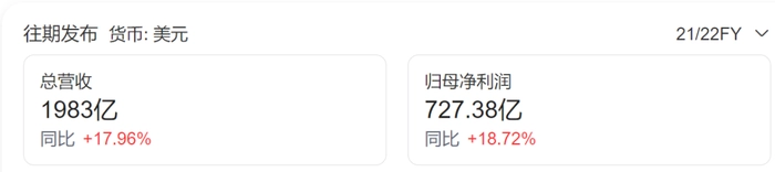 微软在涉足生成式AI之前业绩一直较为出色,财报显示,2022年微软总营收1983亿美元,同比增长高达17.96%,归母净利润为727亿美元,增幅同样高达18.72%。近三年微软营收增幅分别为13.65%、17.53%和17.96%,2022年的营收增幅创近年来的新高。同期归母净利润方面分别为12.85%、38.37%和18.72%,特别是归母净利润增幅18.72%虽然相比2021年有所下滑,但同样保持高增长趋势。