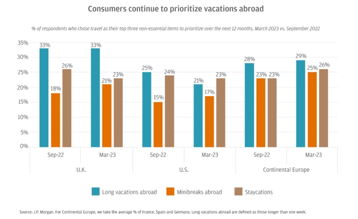 摩根大通研究机构(J.P. Morgan Research)的数据也证实,今年夏季旅游业的前景较为乐观。2023年3月,第三次生活成本调查对美国和欧洲的5000名受访者进行了调查研究。结果显示,度假仍然是消费者相对优先考虑的事情,排在其他非必需品消费之前,特别是出国旅游越来越受欢迎。在英国,选择海外长途度假的受访者比例在3月份略有上升,而选择宅家(staycation)的受访者比例则有所下降。到美国以外地区度长假的美国人减少了,但度短假却增加了,而在美国国内旅游的人也减少了。