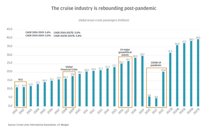 在疫情期间经历了大幅下降后,全球海上邮轮乘客总数预计将在2023年大幅增加,这一趋势将持续到2027年。