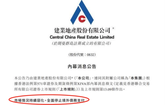 河南建业自今年二季度以来,销售逐渐恶化,建业地产流动资金状况愈发紧张,境外兑付压力较大,为保交楼,全面停止境内外债务支付。