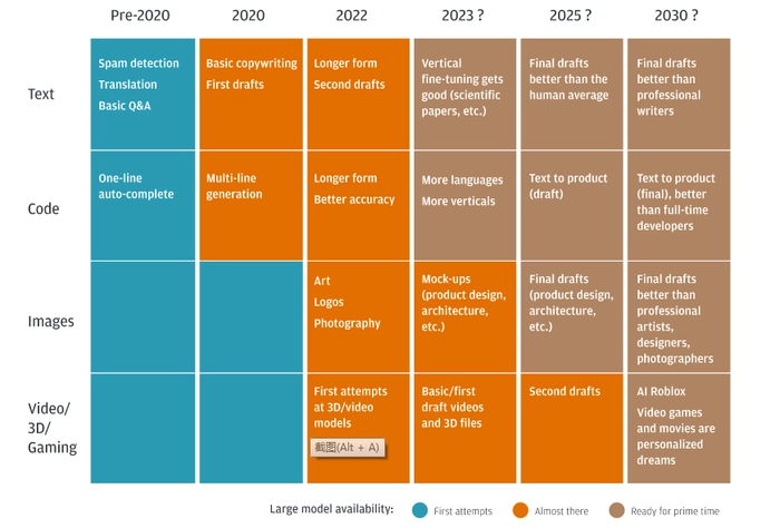 到2030年,生成式人工智能在文本、代码、图像和视频方面的输出预计将呈指数级增长,甚至超过人类人工的生产能力。
