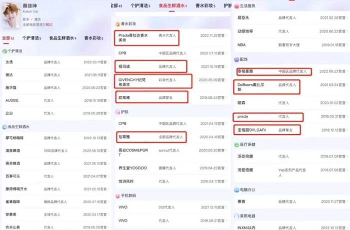 BT财经根据公开资料不完全统计,在短短五年时间内,有40多家知名品牌签约蔡徐坤,使其成为品牌的商业代言人。这40多家品牌中涉及化妆品、手表以及日用品,其中,不乏高奢大牌,比如“钻石恒久远,一颗永流传”的珠宝顶奢戴比尔斯、全球顶级奢侈品Prada、高端护肤品CPB肌肤之钥、高端腕表泰格豪雅。还有大众日常消费的安慕希、可口可乐、VIVO S12、珀莱雅等等,涉及方方面面。不断增多的品牌代言,让蔡徐坤在2019年就登上了福布斯中国名人榜,排到了34名的位置,2020年就在明星商业价值总榜上排名前三。