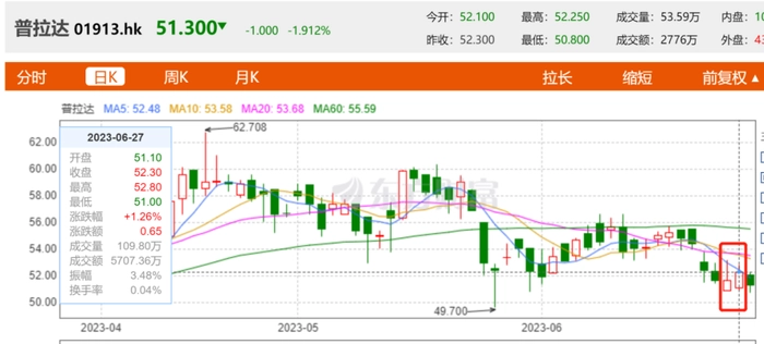 让人意外的是,在蔡徐坤事件曝出后,Prada的股价不降反升,6月27日股价上涨1.26%。在过去的一年里上涨了17.44%,过去五年涨了42.84%。但随着事件的逐渐发酵,6月28日,Prada的股价还是受挫,盘中跌幅近2%,以Prada超过1300亿港元的总市值计算,市值蒸发近30亿港元。