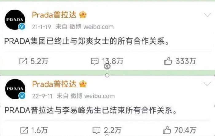 如果说Prada对负面明星持容忍态度,也太冤枉Prada,在郑爽事件爆出后,Prada第一时间和郑爽解约。当了多年品牌代言人的李易峰被曝出嫖娼事件后也被Prada中止合作。