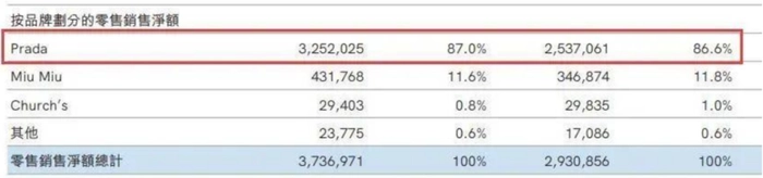 BT财经了解到,Prada集团旗下的品牌并非只有Prada,还有Miu Miu、Church’s,但Prada是其主要营收入来源。财报显示Prada2022年的营收高达32.52亿欧元,营收占比占集团的86.6%,Miu Miu占比只有11.8%,Church’s更是只有1%,其他品牌占比不足1%。