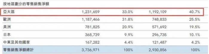 从区域来看,亚太区贡献了营收的41%,作为Prada的根据地欧洲,营收占比只有26%,一度是全球奢侈品消费大区的美洲的贡献比重下降至19.5%,可见亚太地区已经成为Prada最重要的消费市场,而亚太区最大的消费地区是中国市场,Prada掌门人多次强调对中国市场的重视,看重的就是中国市场巨大的消费潜力。