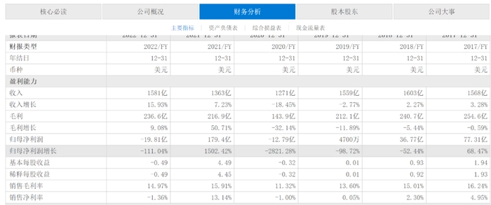 财报显示,福特2022全年其营收约为1581亿美元,同比增长16%。但归母净利润为净亏损19.81亿美元,这是继2020年净亏损12.79亿美元之后的又一次亏损,而2021年的净利润还高达179.42亿美元,一年里外亏损相加总额近200亿美元。