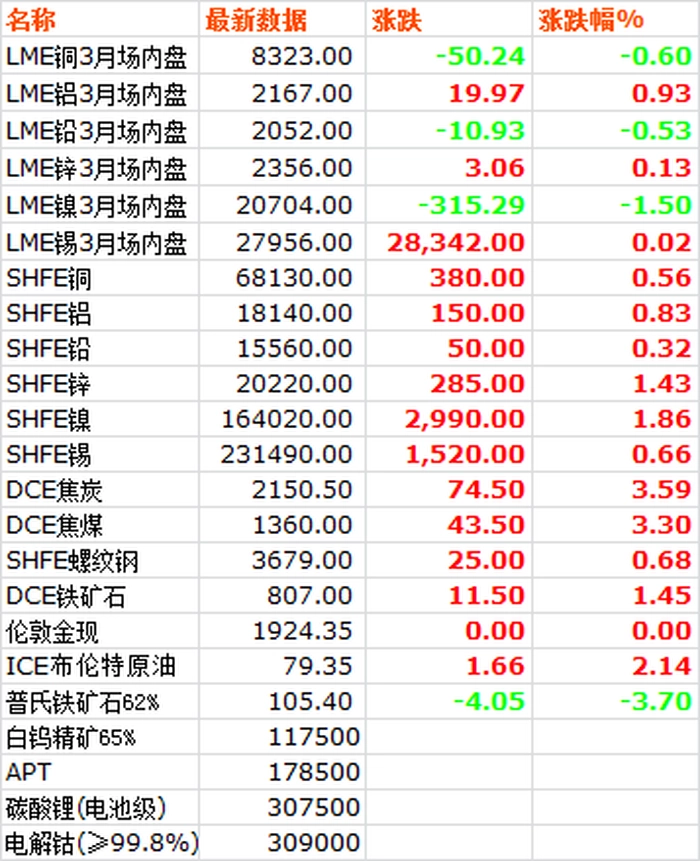 7月11日,LME六种基本金属价格涨跌互现,镍铜铅小幅下跌,铝锌锡小幅上涨。三月期镍价领跌大盘,收于20704,下跌1.5%。三月期铜价冲高回落,最高8448,收于8323,下跌0.6%。三月期铅价收于2052,下跌0.53%。三月期铝价低位反弹上扬,收于2167,上涨0.93%。三月期锌价收于2356,上涨0.13%。三月期锡价高位窄幅徘徊后收于27956,上涨0.02%。