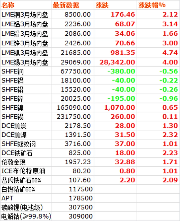 7月12日,LME六种基本金属价格全线上涨,高开大幅高走高收,镍锡暴涨,铝锌铜大涨。三月期镍价领涨大盘,收于21685,上涨4.74%。三月期锡价收于29069,上涨4%。三月期铝价收于2236,上涨3.14%。三月期锌价收于2426,上涨3%。三月期铜价盘中最高8525,收于8500,上涨2.12%。三月期铅价收于2086,上涨1.66%。