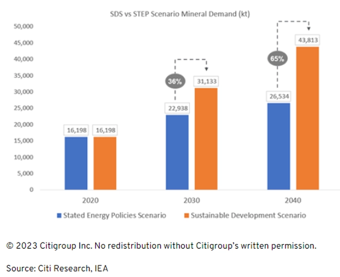 上面的图表突出了既定能源政策(STEP)和可持续发展(SDS)情景下的矿物需求。在2030年和2040年,这两种情景之间存在显著差异,既定能源政策情景下的需求分别比可持续发展情境下低36%和65%。