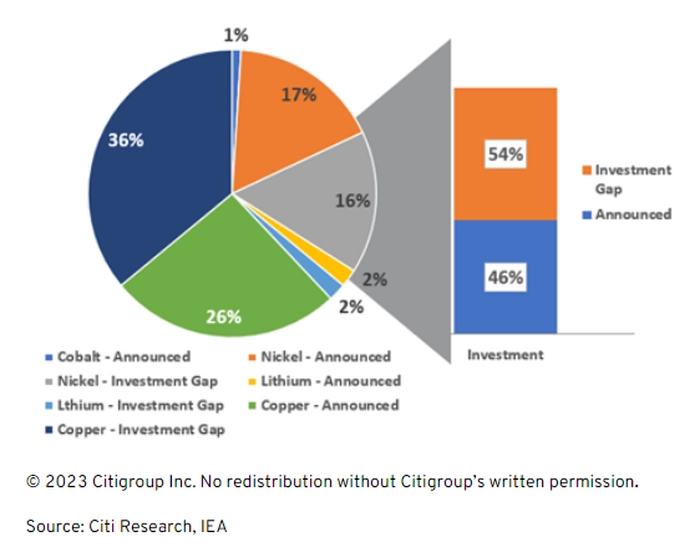 根据国际能源署(IEA)的数据,关键矿产所需的投资在3600亿至4500亿美元之间。考虑到已宣布的项目,目前的投资缺口为54%,即1940亿美元至2430亿美元。目前,投资缺口最大的矿产是铜,占36%,其次是镍,占16%。