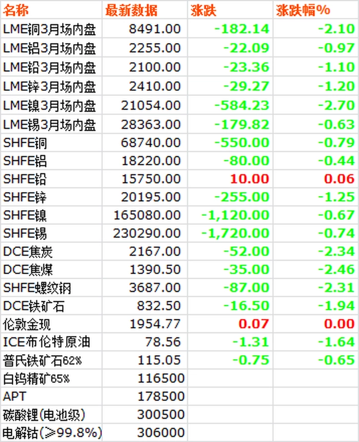 7月17日,LME六种基本金属价格全线下跌,高开低走低收,镍铜锌跌幅居前。三月期镍价领跌大盘,收于21054, 下跌2.7%。三月期铜价收于8491,下跌2.1%。三月期锌价收于2410,下跌1.2%。三月期铅价收于2100,下跌1.1%。三月期铝价收于2255,下跌0.97%。三月期锡价收于28363,下跌0.63%。