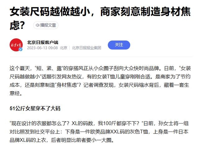 不过,近期《北京日报》等媒体指责优衣库在“制造身材焦虑”,因为媒体调查发现一些服装品牌尺码越做越小,其中就点名优衣库女装尺码比前几年的小了很多,引发了一些女性消费者争相攀比以穿上小尺码的为荣。
