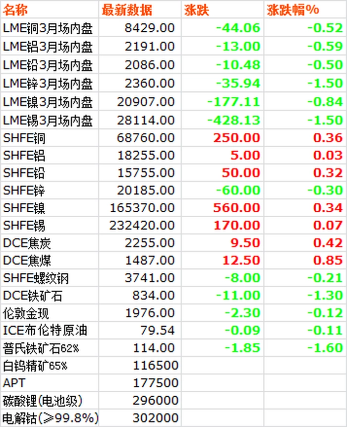 7月19日,LME六种基本金属价格全线下跌,高开低走低收,锡锌跌幅靠前。三月期锡价收于28114,下跌1.5%。三月期锌价收于2360,下跌1.5%。三月期镍价收于20907, 下跌0.84%。三月期铝价收于2191,下跌0.59%。三月期铜价继续高位窄幅拉锯后收于8429,下跌0.52%。三月期铅价收于2086,下跌0.5%。