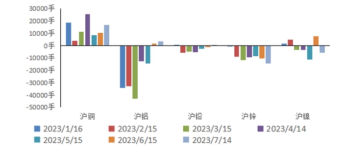 自今年1月中旬至今,国内主力始终保持净多头敞口。7月14日,沪铜持仓量TOP20期货公司净持有多头敞口16700手,6月伴随铜价回升快速扩张多头敞口,7月在铜价年内高位略微收窄多头敞口。7月7日,伦铜商业机构(包括生产商、贸易商、加工商、用户等产业客户)净持空头头寸53145手,较上月同期空头敞口扩大15458手,投资基金转为净持多头头寸18869手,较上月同期空头敞口收缩19230手。