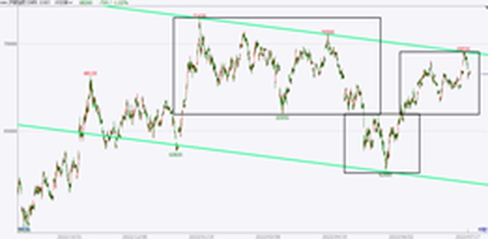 备注:红色区域为短期价格运行区间在长期价格周期中所处的相对位置,并以黑色实线标注7月14日最新价格在短期价格运行区间中的位置。