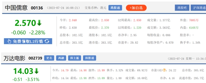 中国儒意收购万达的公告发布后,资本市场对其反应并不强烈,截至24日收盘,中国儒意收盘价2.63港元/股,跌幅为2.28%,总市值263.5亿港元,而中国儒意在2021年2月底股价一度高达17.8港元,和其高位相比股价已经跌去86%,市值蒸发1561亿港元。和王健林有直接关系的万达电影,在24日股价同样下跌了3.51%,整体跌幅达85%,市值蒸发1710亿元。资本市场对两家合作并没有想象中的期待。
