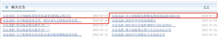 7月11日和7月18日晚间,万达电影分别发布股权变动公告,北京万达投资分别向东方财富实控人的妻子陆丽丽和莘县融智转让其持有的公司股份1.8亿股和1.77股,分别占万达电影总股本的8.26%和8.14%,7月11日转让给陆丽丽的价格为12.07元/股,7月18日转让给莘县融智的价格为13.17元/股,王健林分别回笼资金21.73亿元和23.3亿元,共计45.3亿元,