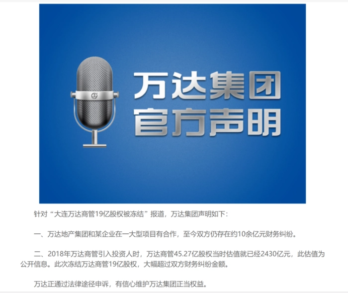 刘纪鹏称,王健林找到刘纪鹏,起初刘纪鹏并不想管,但刘纪鹏后来看到法院冻结了万达商管19.79亿股股权,知道问题的严重性。“这19.79亿股股权,意味着1200多亿的净资产,这些净资产将达万达总资产的三分之一。”2018年万达商管引入投资人时,万达商管45.27亿股权当时估值就已经2430亿元。此次冻结万达商管19.79亿股股权,其金额远远超过和万科的财务纠纷金额,这也是万达和王健林不爽的关键所在,万达通过官方声明宣称,将通过法律手段,有信心维护自身正当权益。